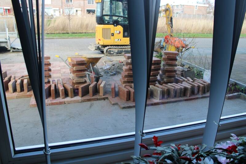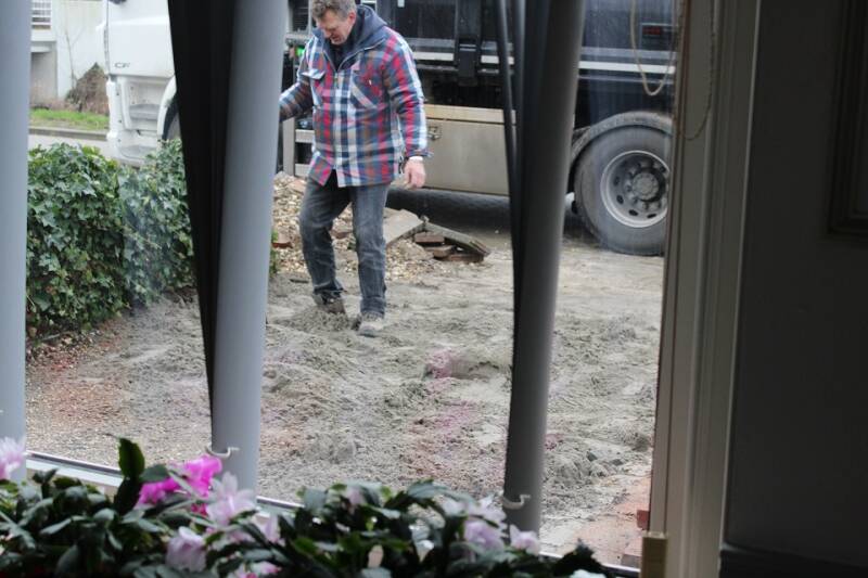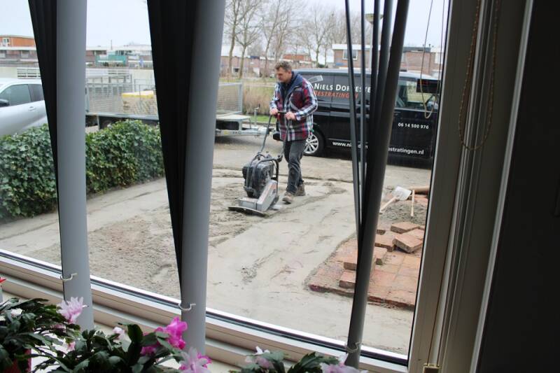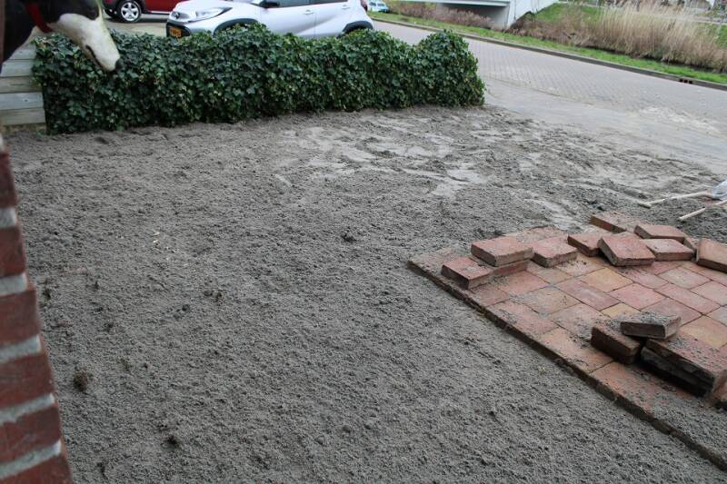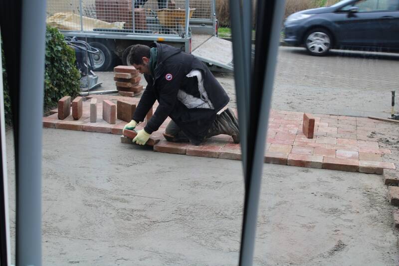 De verbouwing van de voortuin en het terras, oprit en zijkant huis: